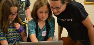 Images: Indiana’s teaching artist Holly Combs with students (above), Wichita teacher, Dyane Smokorowski, Kansas Teacher of the Year, teaching students in immersive game design (below).